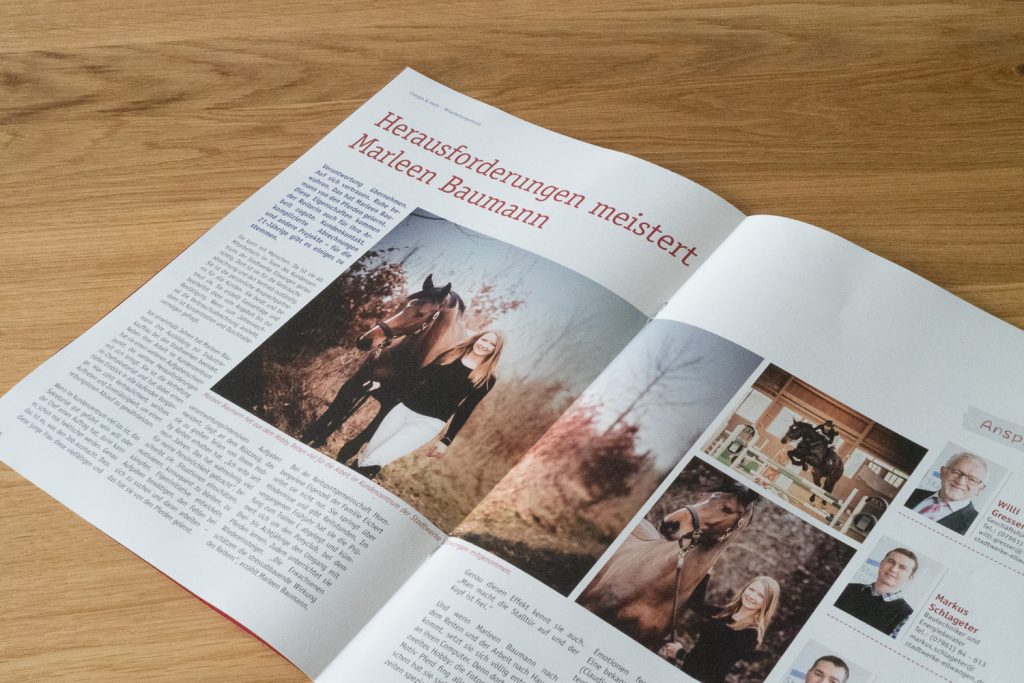 Und wenn Marleen Baumann nach dem Reiten und der Arbeit nach Hause kommt, setzt sie sich völlig entspannt an ihren Computer. Denn dort wartet ihr zweites Hobby: die Fotografie. Mit dem Motiv Pferd fing alles an. Aber inzwischen hat sie sich auf Paare und Hochzeiten spezialisiert. „Mir macht es Spaß Emotionen festzuhalten“, sagt sie. Eine bekannte Fotografin aus München (Claudia Rahlmeier) erkannte ihr Potential und motivierte sie, professionell einzusteigen. Seitdem ist nicht mehr nur der Familien- und Freundeskreis vor der Linse, sondern viele zufriedene Hochzeitspaare. Sie lebt ein menschennahes und abwechslungsreiches Leben – beruflich wie privat. Sie nimmt Herausforderungen an, an denen sie weiter wachsen kann.