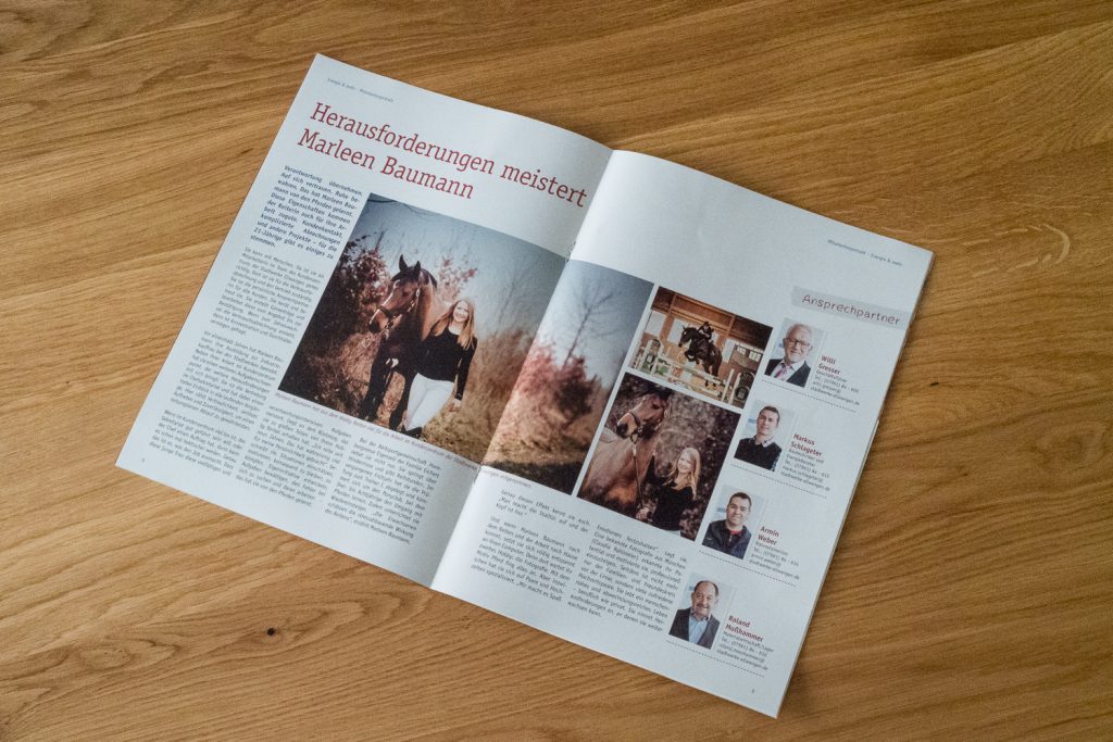 Verantwortung übernehmen. Auf sich vertrauen. Ruhe bewahren. Das hat Marleen Baumann von den Pferden gelernt. Diese Eigenschaften kommen der Reiterin auch für ihre Arbeit zugute. Kundenkontakt, komplizierte Abrechnungen und andere Projekte – für die 21-Jährige gibt es einiges zu stemmen.
